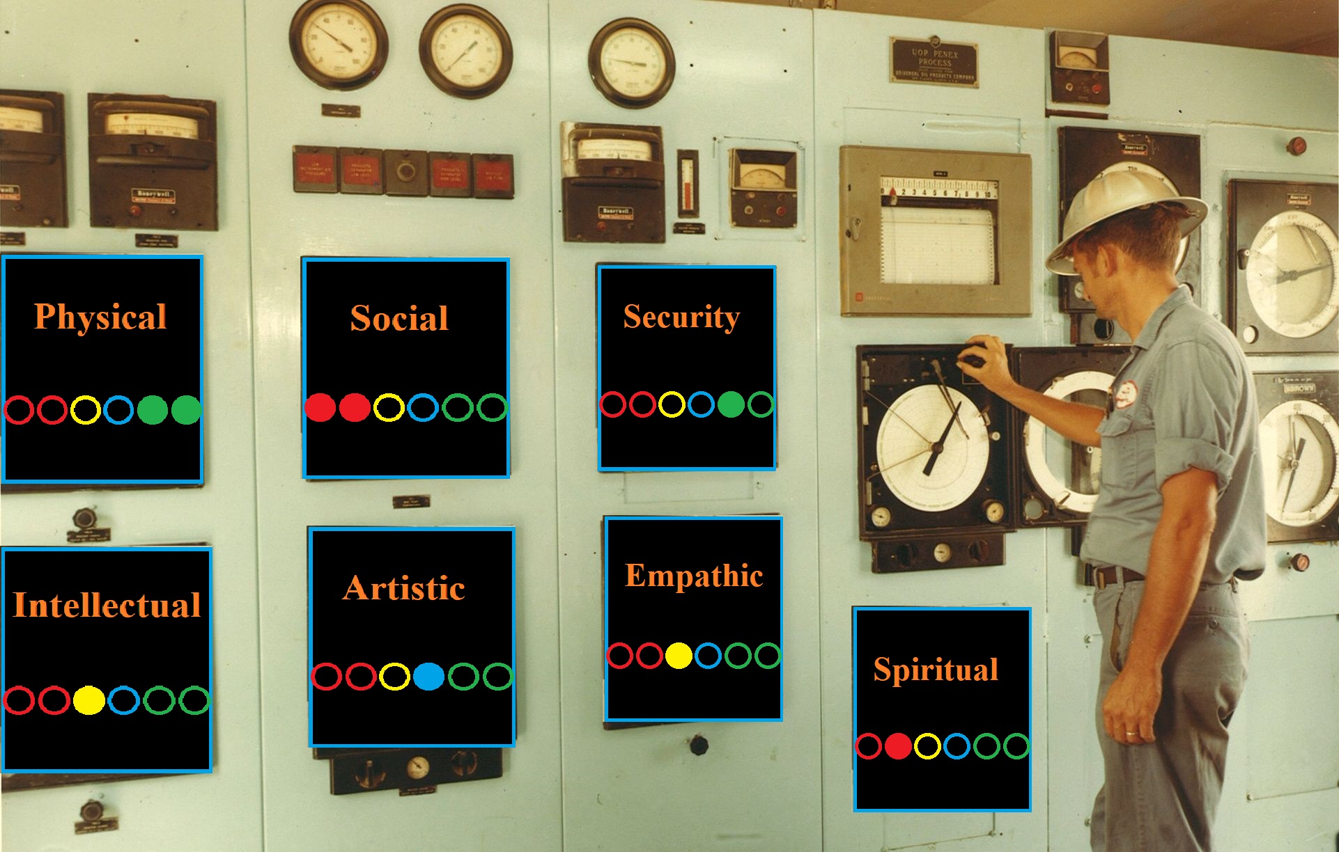 The very highest-level indicator would be just one gauge, showing "happiness" and